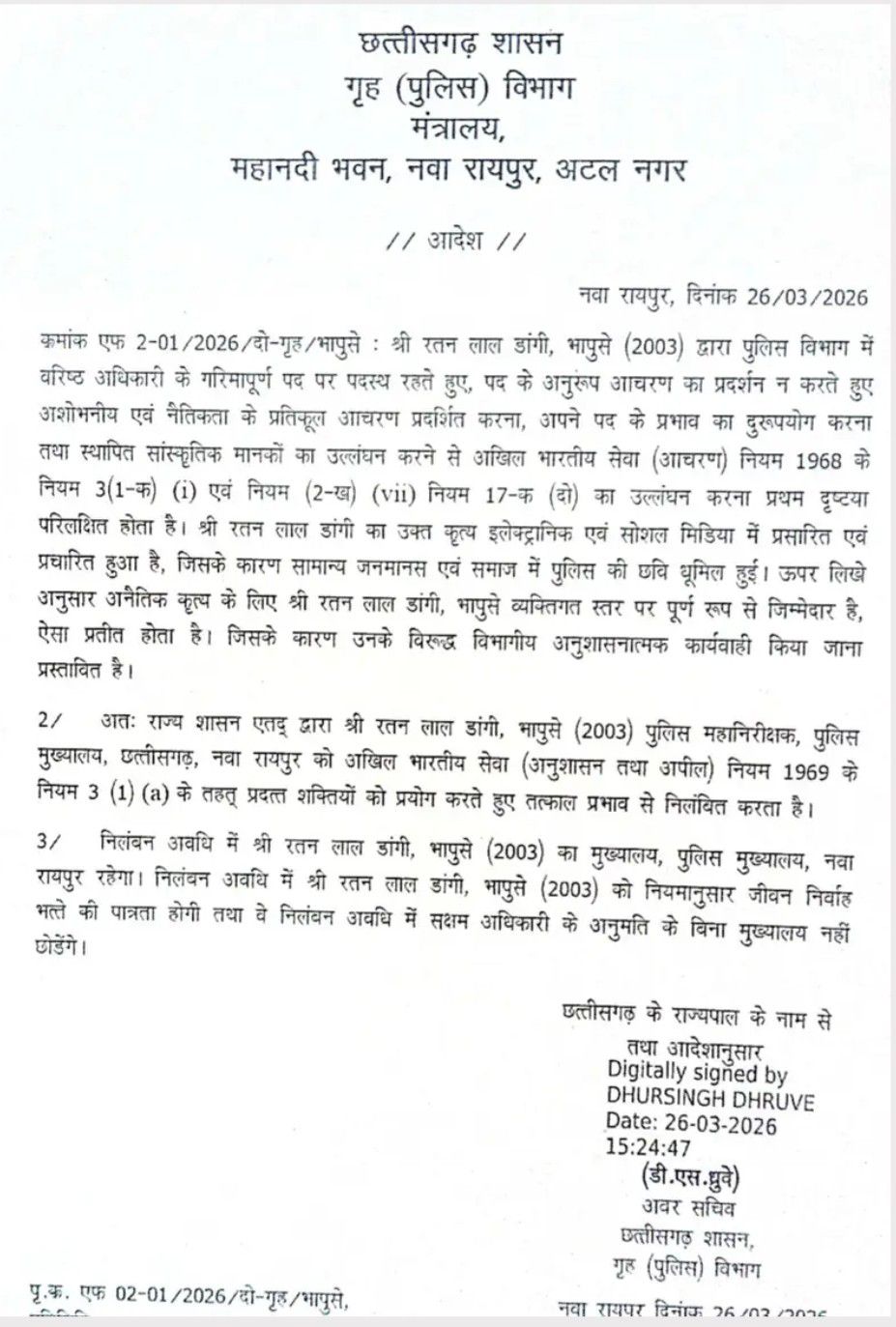 रायपुर (पब्लिक फोरम)। छत्तीसगढ़ शासन ने एक बड़ी प्रशासनिक कार्रवाई करते हुए वरिष्ठ भारतीय पुलिस सेवा (IPS) अधिकारी रतन लाल डांगी (बैच 2003) को तत्काल प्रभाव से निलंबित कर दिया है। राज्य के गृह (पुलिस) विभाग ने मंत्रालय, नवा रायपुर से यह आदेश जारी किया है।