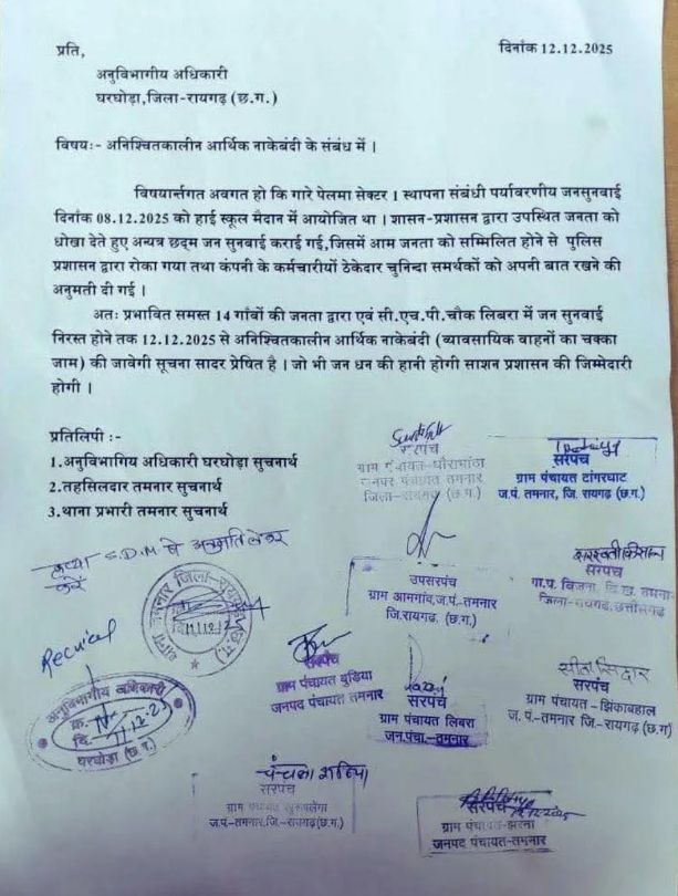 प्रशासन के इस रवैये से आक्रोशित होकर प्रभावित 14 गांवों की जनता ने अब आर-पार की लड़ाई का मन बना लिया है। आज अनुविभागीय अधिकारी (SDO) घरघोड़ा को सौंपे गए ज्ञापन में स्पष्ट कहा गया है कि जब तक 8 दिसंबर की विवादित जनसुनवाई को निरस्त नहीं किया जाता, तब तक आंदोलन जारी रहेगा।