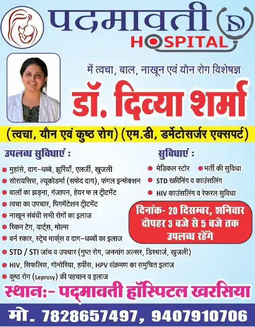 खरसिया (पब्लिक फोरम) अस्पताल प्रबंधन के द्वारा दी गई जानकारी के अनुसार पद्मावती हॉस्पिटल, खरसिया में प्रसिद्ध त्वचा एवं कुष्ठ रोग विशेषज्ञ डॉ. दिव्या शर्मा शनिवार, 20 दिसंबर 2025 को दोपहर 3:00 बजे से 5:00 बजे तक मरीजों के लिए उपलब्ध रहेंगी।