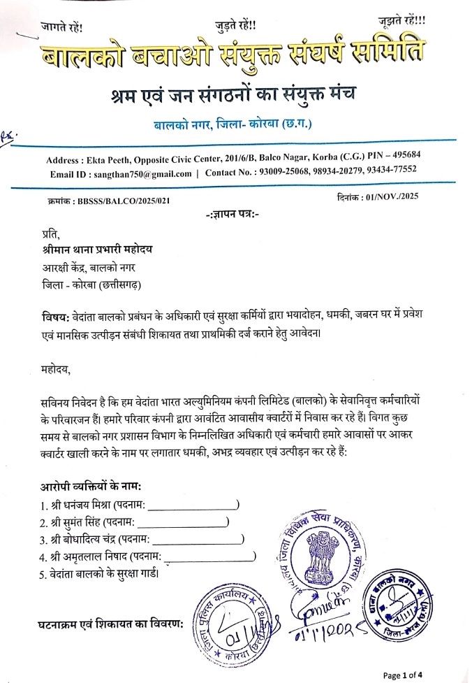 कोरबा (पब्लिक फोरम)। छत्तीसगढ़ के कोरबा जिले में स्थित वेदांता बालको की कंपनी कॉलोनी में रहने वाले सेवानिवृत्त कर्मचारियों के परिवारों ने कंपनी के अधिकारियों और सुरक्षाकर्मियों पर गंभीर आरोप लगाते हुए थाना प्रभारी के समक्ष प्राथमिकी ( FIR) दर्ज कराने की मांग की है। शिकायतकर्ताओं का आरोप है कि क्वार्टर खाली कराने के नाम पर उनके साथ अभद्र व्यवहार, धमकी और मानसिक उत्पीड़न किया जा रहा है।