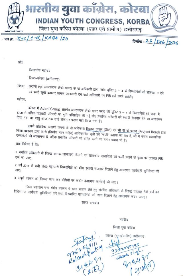 कोरबा (पब्लिक फोरम)। छत्तीसगढ़ के कोरबा जिले में अडानी समूह के अंतर्गत संचालित पूर्व अमरकंटक लैंको पावर प्लांट की यूनिट 34 से जुड़ा एक गंभीर विवाद अब सड़क से सीधे जिला प्रशासन के दरवाजे तक पहुंच गया है। भारतीय युवा कांग्रेस, कोरबा (शहर एवं ग्रामीण) ने जिलाधीश को एक ज्ञापन सौंपकर अडानी कंपनी के दो वरिष्ठ अधिकारियों के विरुद्ध तत्काल FIR दर्ज करने की मांग की है।