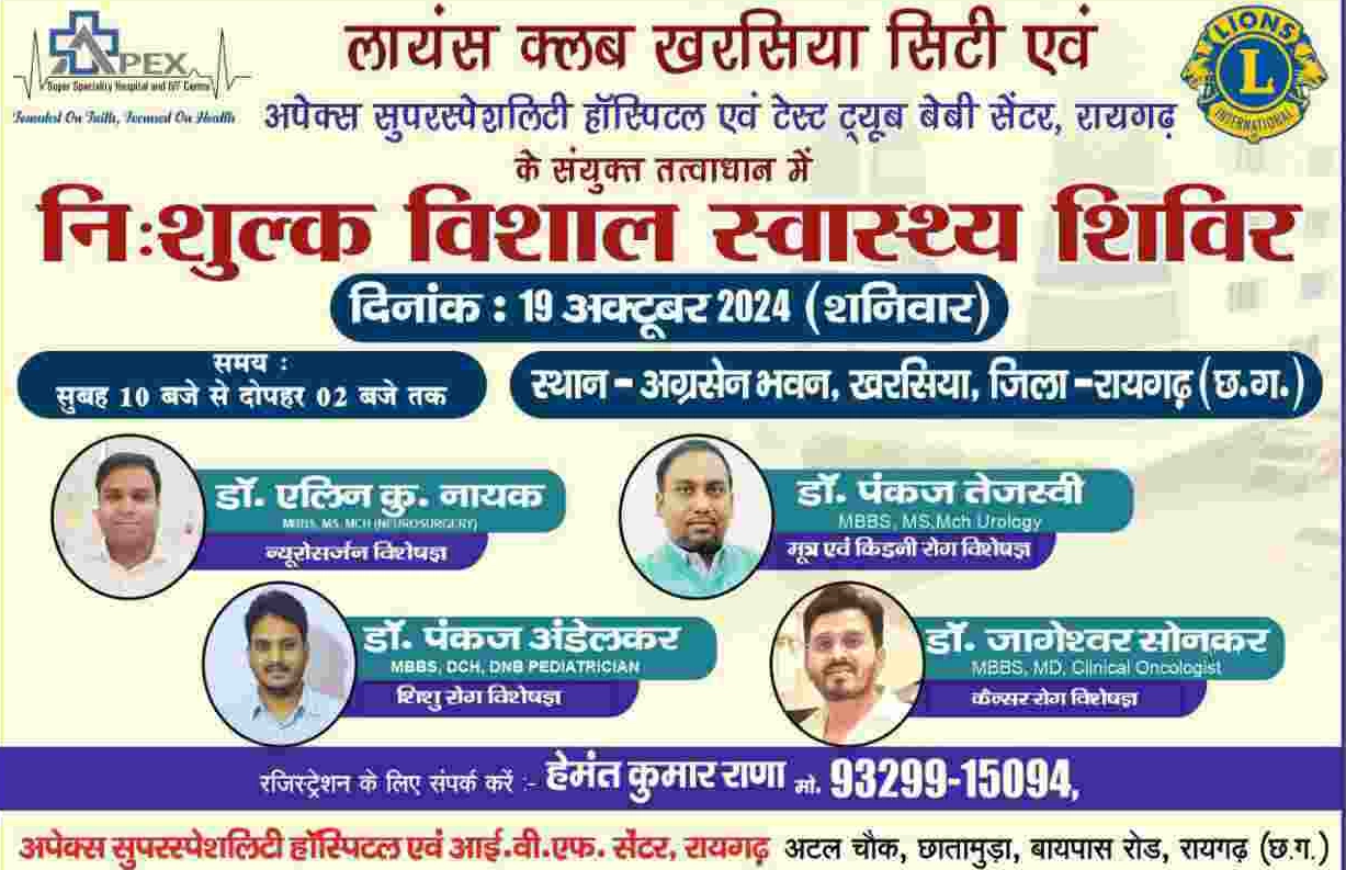 खरसिया (पब्लिक फोरम)। लायंस क्लब खरसिया सिटी और अपेक्स सुपरस्पेशलिटी हॉस्पिटल के संयुक्त तत्वाधान में 19 अक्टूबर को एक निःशुल्क स्वास्थ्य जांच एवं परामर्श शिविर का आयोजन किया जा रहा है। यह शिविर अग्रसेन भवन, खरसिया में होगा, जिसमें कई अनुभवी विशेषज्ञ अपनी सेवाएं निःशुल्क प्रदान करेंगे।शिविर में नस रोग विशेषज्ञ डॉ. एलिन कुमार नायक, मूत्र रोग विशेषज्ञ डॉ. पंकज तेजस्वी, कैंसर रोग विशेषज्ञ डॉ. जागेश्वर सोनकर और शिशु रोग विशेषज्ञ डॉ. पंकज अंडेलकर मौजूद रहेंगे। ये सभी विशेषज्ञ विभिन्न गंभीर रोगों से संबंधित निःशुल्क जांच और परामर्श देंगे।