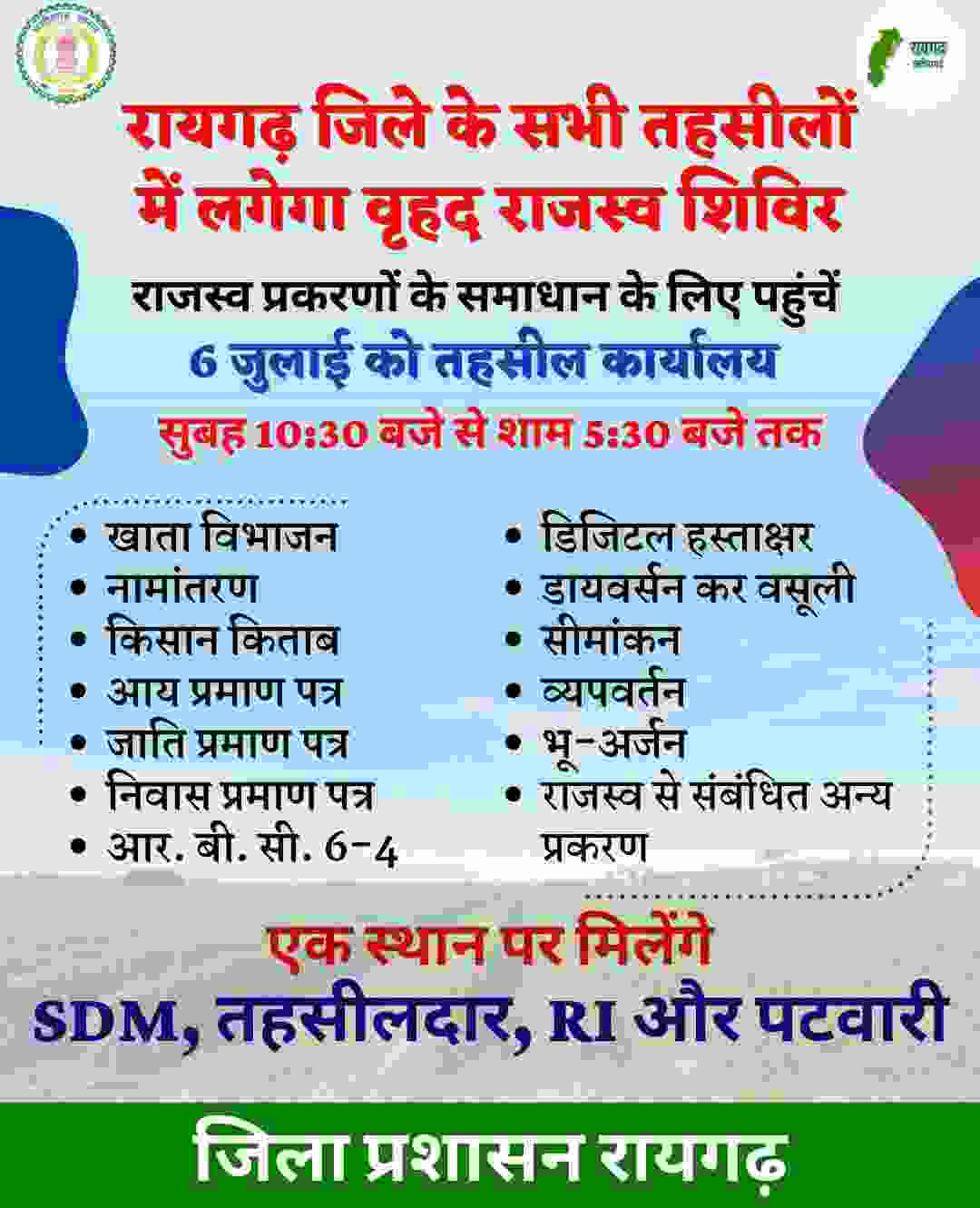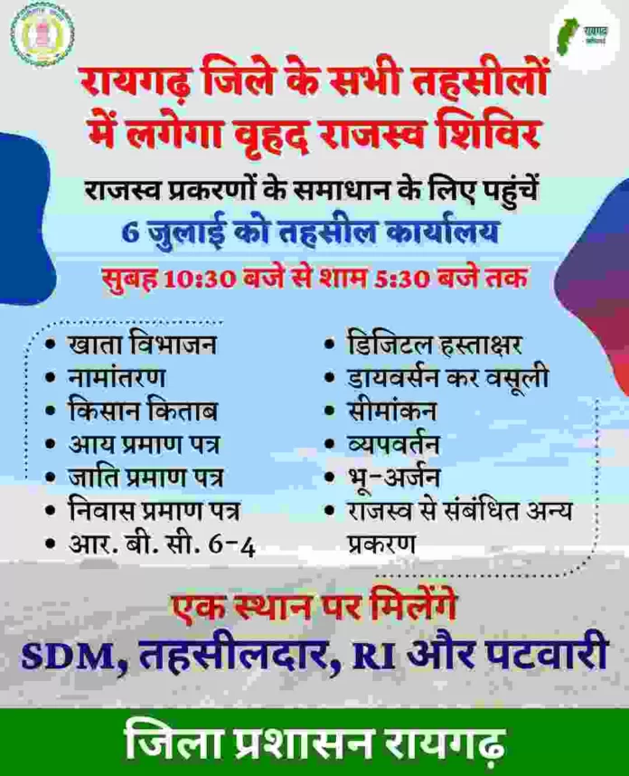 रायगढ़ (पब्लिक फोरम)। राजस्व मामलों के निराकरण के लिए कलेक्टर तारन प्रकाश सिन्हा के निर्देश पर आगामी 6 जुलाई दिन गुरुवार को सभी तहसील कार्यालयों में प्रात: 10.30 बजे से राजस्व शिविर लगाए जाएंगे। जहां एसडीएम, तहसीलदार, नायब तहसीलदार, आरआई व पटवारी सहित पूरा राजस्व अमला मौजूद होगा। कलेक्टर श्री तारन प्रकाश सिन्हा ने शिविर की तैयारी के निर्देश देते हुए कहा कि क्षेत्र के सभी गांवों में शिविर आयोजन के संबंध में सूचना दी जाए।