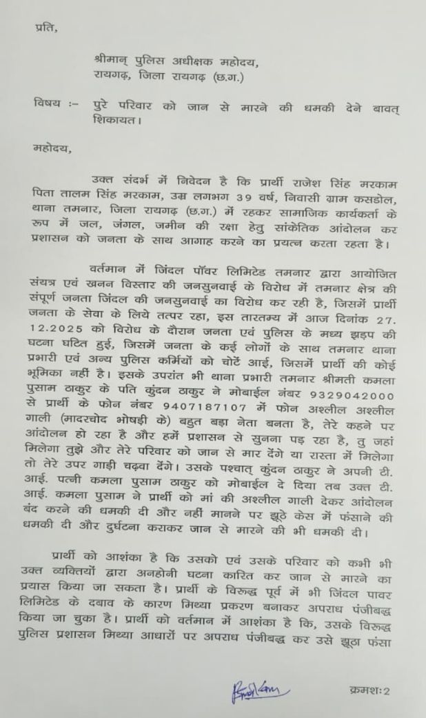 रायगढ़ (पब्लिक फोरम)। छत्तीसगढ़ के रायगढ़ जिले में औद्योगिक विकास और आदिवासियों के ‘जल, जंगल, जमीन’ के संघर्ष के बीच एक बेहद गंभीर और संवेदनशील मामला सामने आया है। तमनार थाना क्षेत्र के कसडोल निवासी और सामाजिक कार्यकर्ता राजेश सिंह मरकाम ने पुलिस प्रशासन पर ही अपनी और अपने परिवार की हत्या की साजिश रचने का आरोप लगाया है। उन्होंने पुलिस अधीक्षक (SP) को लिखे एक पत्र में दावा किया है कि तमनार थाना प्रभारी और उनके पति ने उन्हें फोन पर न केवल अश्लील गालियां दीं, बल्कि एनकाउंटर या सड़क दुर्घटना में मारने की धमकी भी दी है।