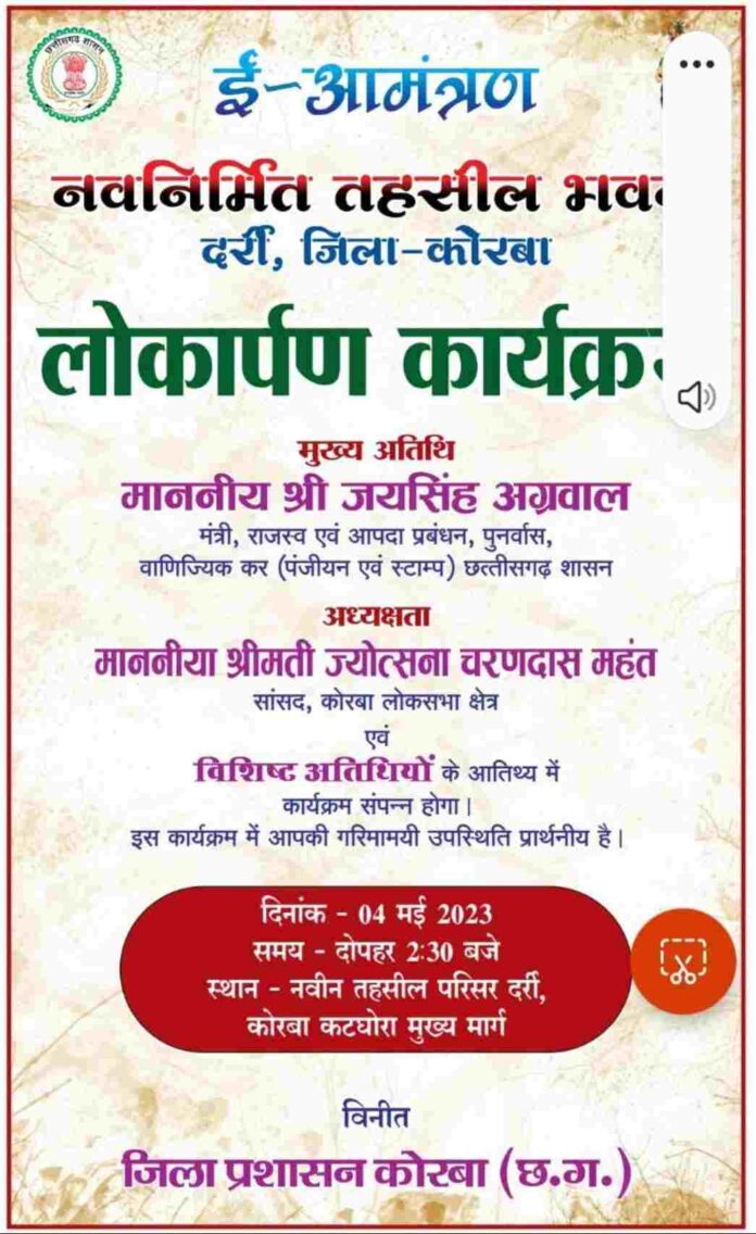 कोरबा (पब्लिक फ़ोरम)। दर्री में नवनिर्मित तहसील कार्यालय भवन का लोकार्पण 04 मई को दोपहर 02.30 बजे मुख्य अतिथि राजस्व एवं आपदा प्रबंधन, पुनर्वास वाणिज्यिक कर (पंजीयन एवं स्टाम्प ) मंत्री छत्तीसगढ़ शासन श्री जयसिंह अग्रवाल, अध्यक्षता सांसद कोरबा लोकसभा श्रीमती ज्योत्सना चरणदास महंत सहित विशिष्ट अतिथियों की उपस्थिति में किया जाएगा।