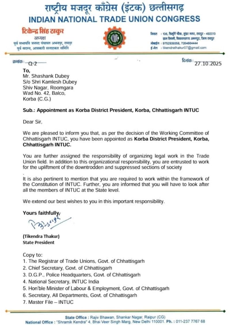 कोरबा/बालकोनगर (पब्लिक फोरम)। भारतीय राष्ट्रीय मजदूर कांग्रेस (इंटक) छत्तीसगढ़ की कार्यकारी समिति ने एक बार फिर शशांक दुबे को कोरबा जिला अध्यक्ष के रूप में नियुक्त किया है। श्री दुबे की पुनर्नियुक्ति को जिले भर के मजदूर संगठनों में सकारात्मक कदम के रूप में देखा जा रहा है।