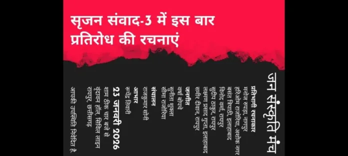 रायपुर (पब्लिक फोरम)। जन संस्कृति मंच (जसम) की रायपुर इकाई द्वारा 23 जनवरी 2026 को आयोजित ‘सृजन संवाद-3’ समकालीन साहित्य, वैचारिक विमर्श और सांस्कृतिक प्रतिरोध का सशक्त मंच बनेगा। सिविल लाइन स्थित वृंदावन हॉल में शाम चार बजे से शुरू होने वाले इस आयोजन में देश के चर्चित लेखक, कवि, आलोचक और संस्कृतिकर्मी एकत्र होंगे। कार्यक्रम का केंद्र प्रतिवाद की रचनाएँ होंगी—जिनका पाठ, संवाद और विचार-विनिमय समकालीन समय के प्रश्नों से सीधे जुड़ता है।