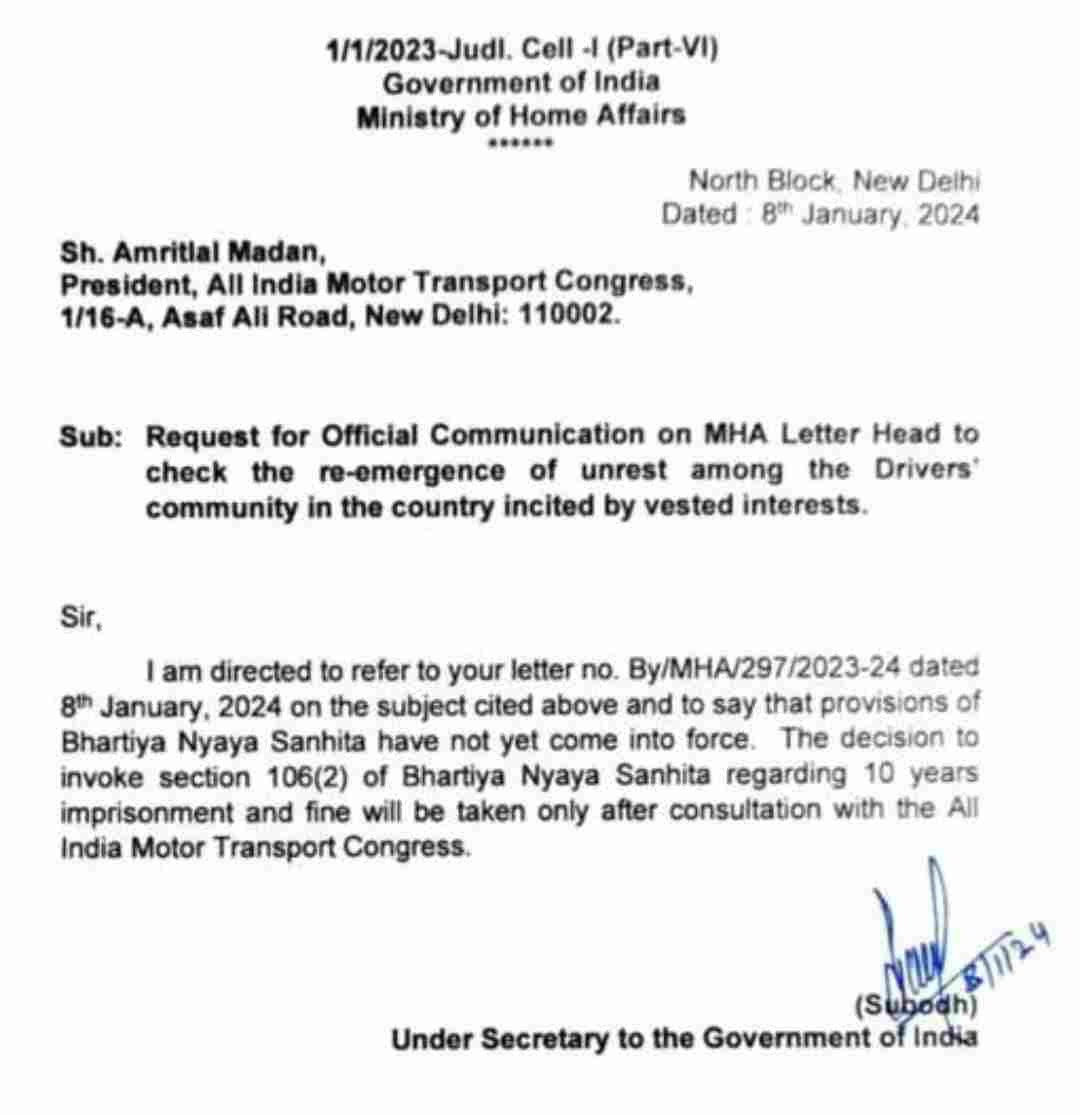 उल्लेखनीय है कि केंद्रीय गृह मंत्रालय द्वारा आल इंडिया मोटर ट्रांसपोर्ट कांग्रेस को पत्र प्रेषित कर स्पष्ट किया है कि भारत सरकार का संबंधित विभाग इस कानून को लागू करने से पहले अखिल भारतीय मोटर ट्रांसपोर्ट कांग्रेस के प्रतिनिधियों से बातचीत करेगी और उसके बाद ही कोई फैसला लिया जाएगा। केंद्रीय गृह सचिव श्री अजय भल्ला ने कहा है कि भारतीय न्याय संहिता 106(2) लागू करने से पहले हम ऑल इंडिया मोटर ट्रांसपोर्ट कांग्रेस के प्रतिनिधियों के साथ चर्चा करेंगे और उसके बाद ही हम कोई निर्णय लेंगे।