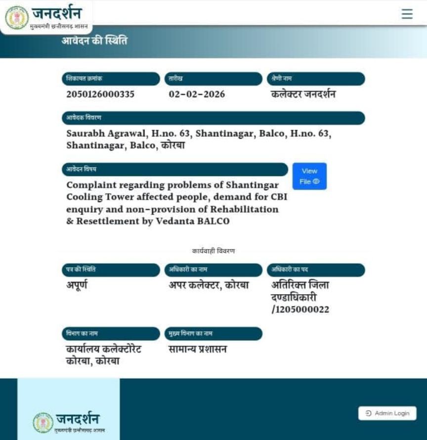 प्रशासनिक उदासीनता का आलम यह है कि राज्यपाल को पत्र लिखने के बाद, स्थानीय स्तर पर जिला कलेक्टर को भी जनदर्शन कार्यक्रम के तहत आवेदन (टोकन क्रमांक: 2050126000335, दिनांक 02/02/2026) दिया गया। विडंबना यह है कि आवेदन देने के बावजूद अब तक प्रशासन की ओर से कोई भी ठोस या प्रभावी कार्रवाई धरातल पर नहीं दिखाई दी है।