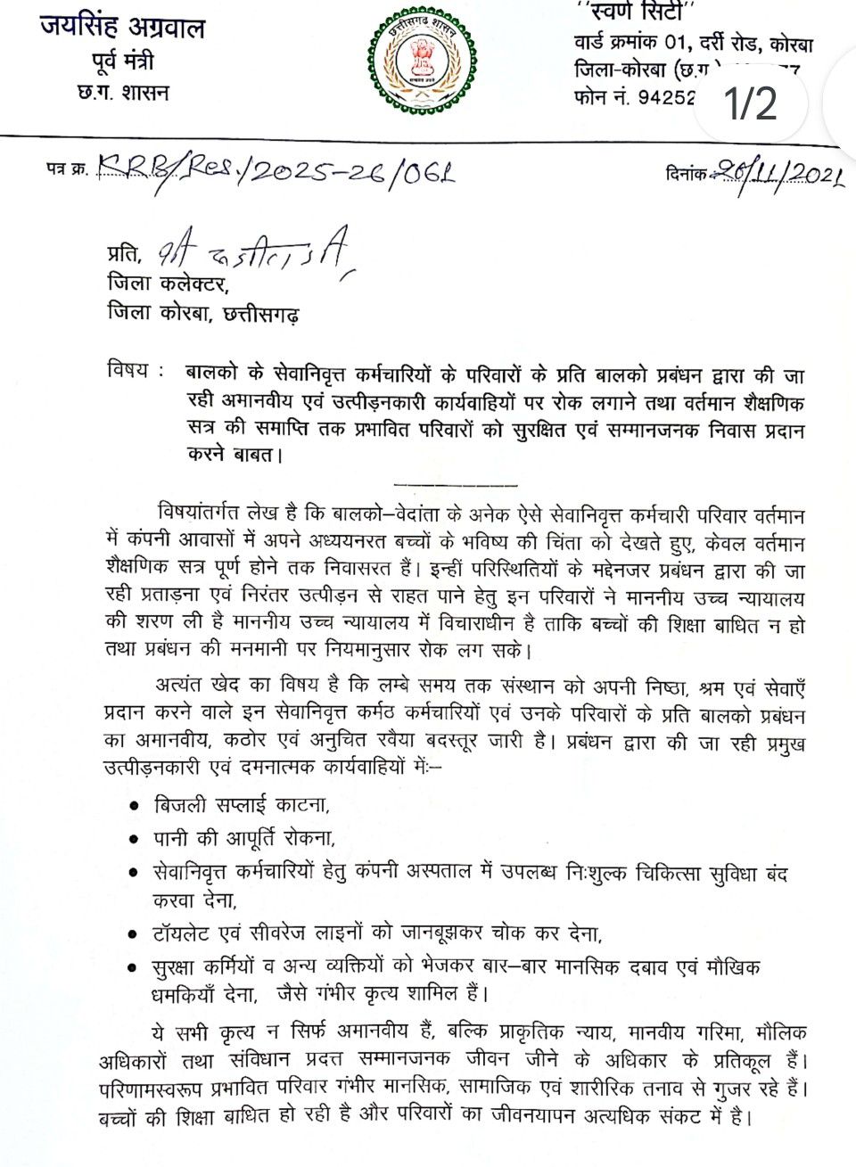 पत्र की प्रतिलिपि मुख्यमंत्री, पुलिस अधीक्षक और सीईओ बालको को भी भेजी गई है।
