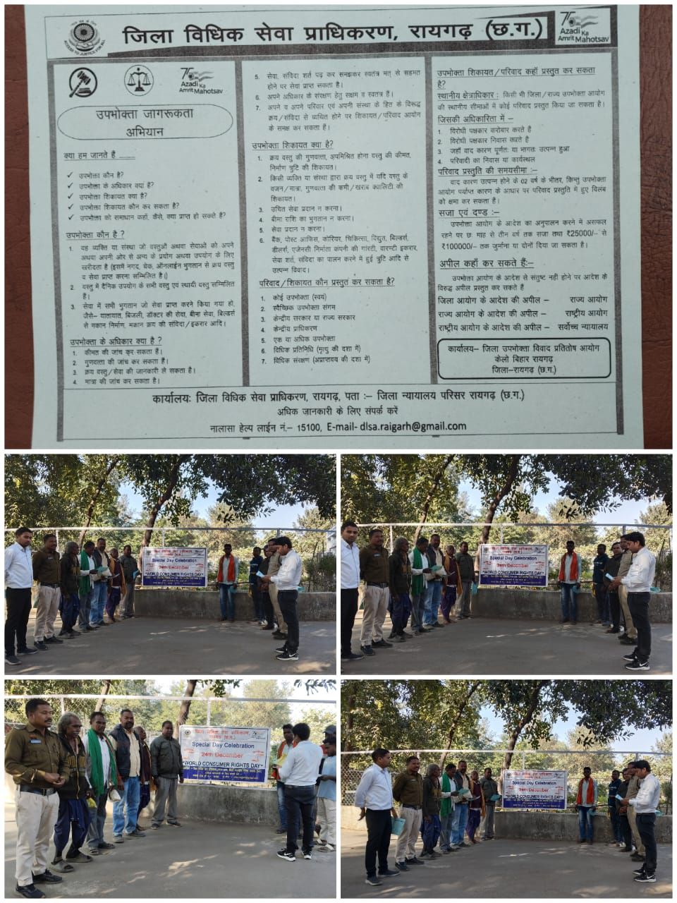 रायगढ़-घरघोड़ा (पब्लिक फोरम) ।जिला विधिक सेवा प्राधिकरण रायगढ़ अध्यक्ष/प्रधान जिला न्यायाधीश जितेंद्र जैन एवं तालुका विधिक सेवा समिति घरघोड़ा अध्यक्ष/विशेष न्यायाधीश शहाबुद्दीन कुरैशी तथा जिला अपर सत्र न्यायाधीश अभिषेक शर्मा के मार्गदर्शन में थाना पूंजीपथरा पीएलव्ही बालकृष्ण एवं थाना घरघोड़ा पीएलव्ही लवकुमार द्वारा विश्व उपभोक्ता अधिकार दिवस के अवसर पर आम नागरिकों को उनके उपभोक्ता अधिकारों एवं कानूनी संरक्षण की जानकारी देने के उद्देश्य से एक विधिक जागरूकता शिविर का आयोजन किया गया। इस कार्यक्रम का मुख्य उद्देश्य उपभोक्ताओं को उनके अधिकारों, कर्तव्यों तथा उपलब्ध कानूनी सहायता योजनाओं से अवगत कराना रहा।कार्यक्रम में उपस्थित लोगों को पीएलव्ही द्वारा बताया गया कि आज के समय में उपभोक्ताओं को ठगी, मिलावट, घटिया वस्तुएँ, भ्रामक विज्ञापन एवं ऑनलाइन धोखाधड़ी जैसी समस्याओं का सामना करना पड़ रहा है। ऐसी स्थिति में उपभोक्ताओं का जागरूक होना अत्यंत आवश्यक है। शिविर में उपभोक्ता संरक्षण अधिनियम, 2019 के बारे में विस्तार से जानकारी दी गई। अधिकार मित्रों ने बताया कि इस कानून के अंतर्गत उपभोक्ताओं को निम्नलिखित अधिकार प्राप्त हैं—